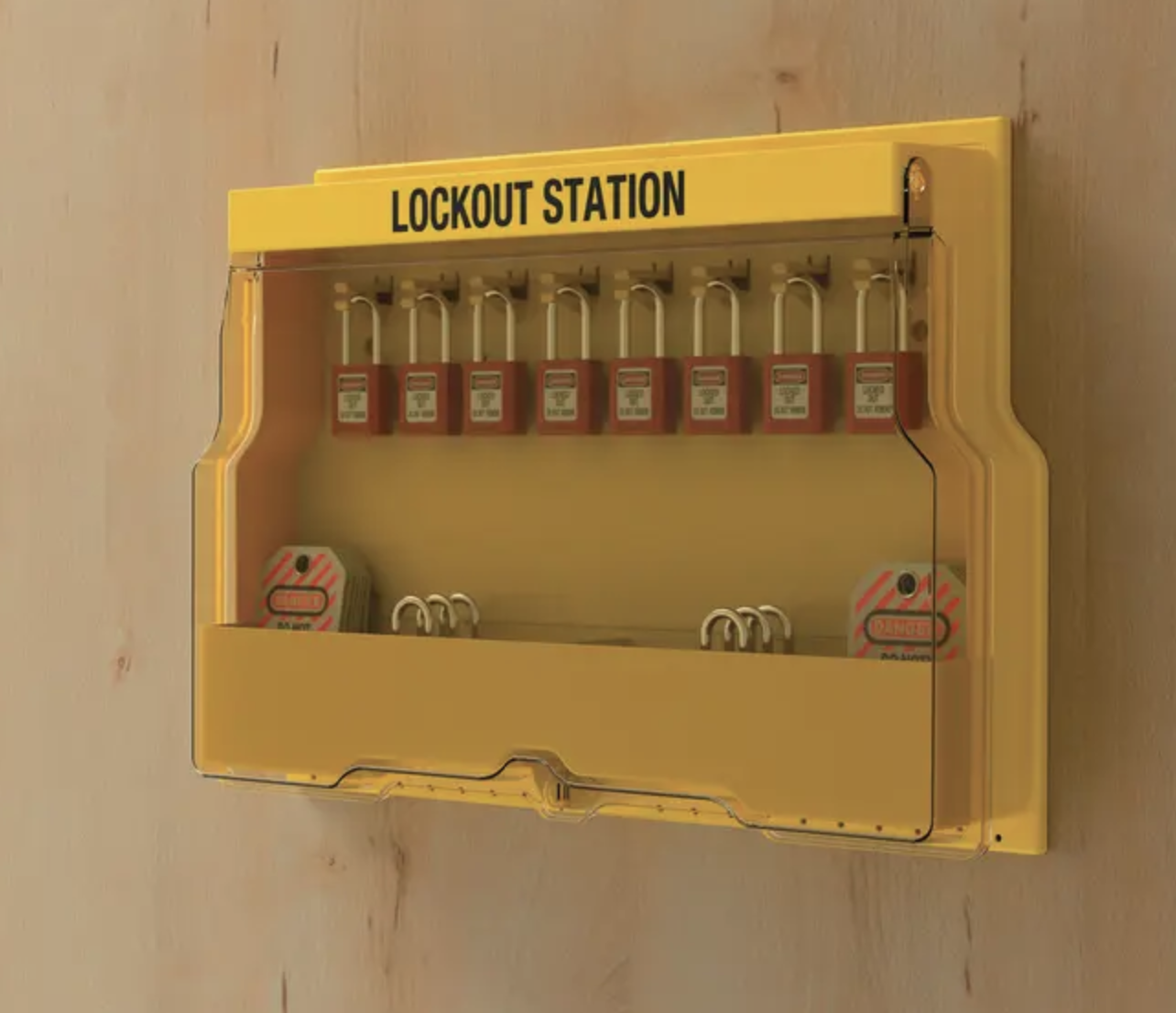 Large capacity station stores plenty of lockout devices to equip a department for lockout